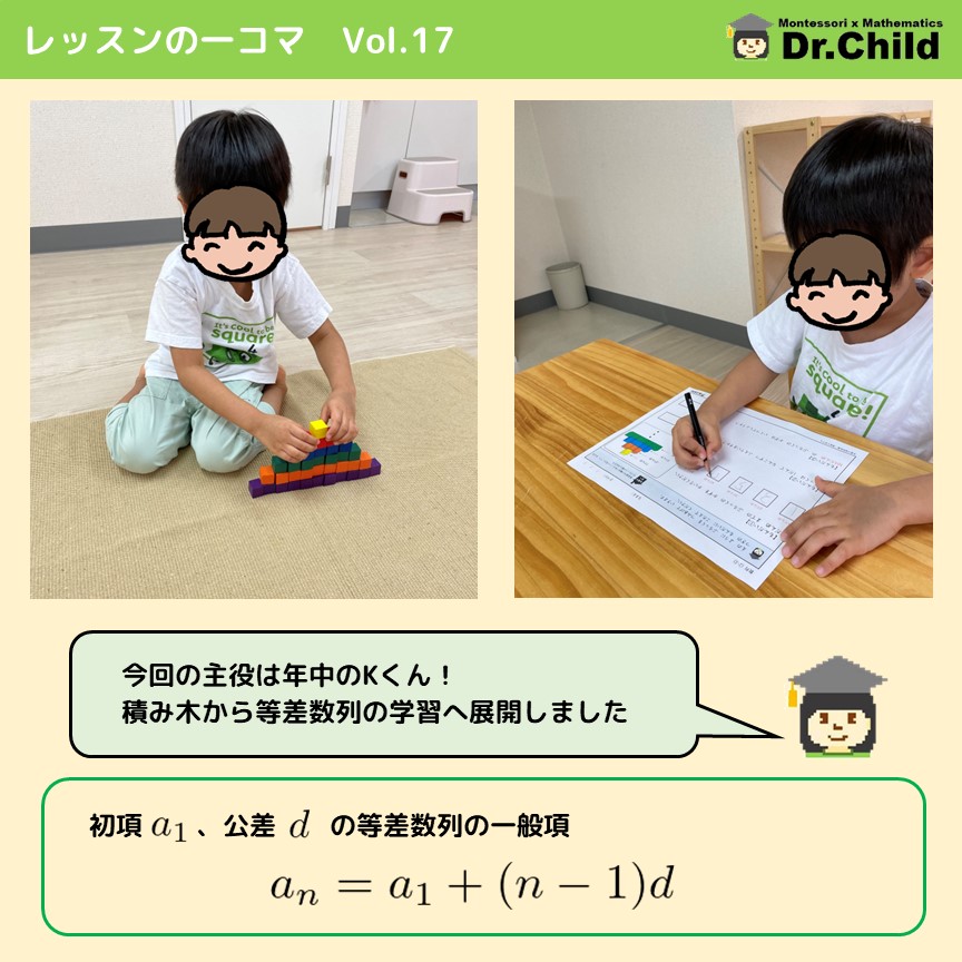 このような準備を経て、Kくんが組み立てた積み木について解析していきました。Kくんは上で学んだ数列と同じ構造を持つことや、ある段で必要となるブロックの数を計算で求められることを知ると、非常に嬉しそうでした!生きた数学を楽しく学ばれている様子を見ると、非常に嬉しいです。